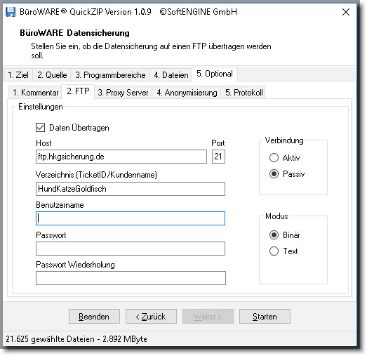 Wenn die erzeugte ZIP-Datei direkt nach dem Packen per FTP übertragen werden soll, können Sie unter „2. FTP“ die betreffenden Einstellungen vornehmen.