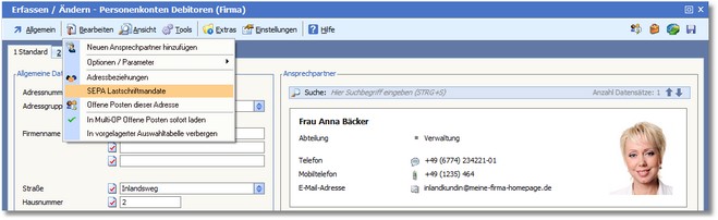 Die SEPA-Mandate werden immer beim Vertragspartner hinterlegt und verwaltet. Sie können die Mandate in den Stammdaten des jeweiligen Kunden/Lieferanten aufrufen. Hier können Sie Mandate erfassen, bearbeiten und löschen.