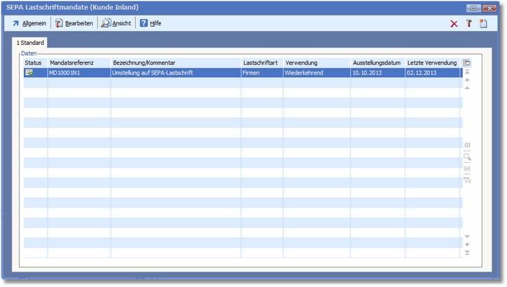 Das Programm öffnet die Auswahltabelle der Lastschriftmandate des Kunden. Einem Kunden können mehrere SEPA-Lastschriftmandate zugeordnet sein.