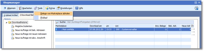 1. Klicken Sie in der Karteikarte "Download Belege" des Shopmanagers auf "Tools > Belege von Marketplace abholen".