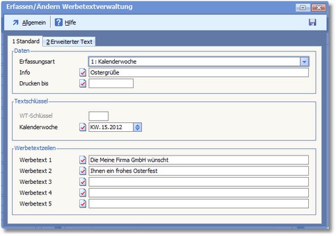 Navigation:  OfficePlaner > Stammdaten > Basisdaten > Werbetexte > Werbetexte erfassen/ändern >