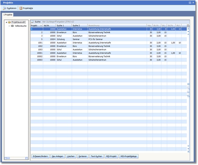 Das Programm öffnet eine vorgelagerte Auswahltabelle, in der bereits erfasste Projekte angezeigt werden.