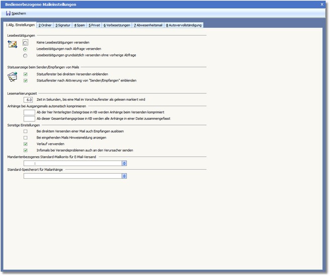 << Hier KLicken um eine Inhaltsübersicht anzuzeigen >> Navigation: OfficePlaner > Mailsystem > Mail einrichten > E-Mail-Assistent - Extras > Bedienerbezogene Einstellungen > Die Karteikarte "Allg. Einstellungen" |
