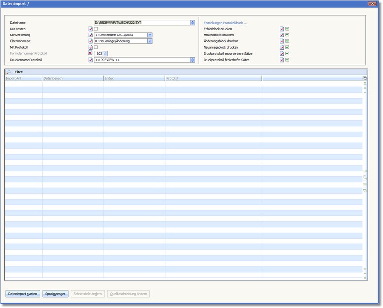 Auf dem Protokoll werden alle importierbaren Sätze ausgegeben, wenn Sie den Status dieses Feldes þ aktivieren.