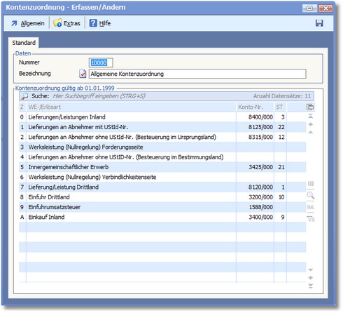 << Hier KLicken um eine Inhaltsübersicht anzuzeigen >> Navigation: Warenwirtschaft > Stammdaten > Basisdaten > Kontenzuordnung > Die Karteikarte "Standard" |