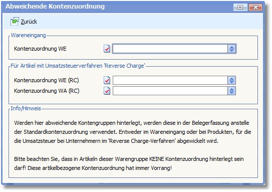 Wenn das Reverse-Charge-Verfahren für bestimmte Artikel in einem Beleg angewendet werden soll, sind Konten und Steuerschlüssel unterschiedlich. Daher müssen zuvor in den Basisdaten Kontenzuordnungen für Wareneingang und Warenausgang angelegt werden. Diese Kontenzuordnungen müssen anschließend hier eingetragen werden.