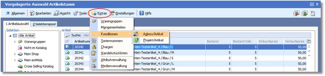 2. Wählen Sie in der Tabelle den Artikel aus, dessen Adress/Artikelkonditionen angelegt oder geändert werden sollen und wählen Sie den Menüpunkt "Extras / Konditionen / Adress/Artikel".