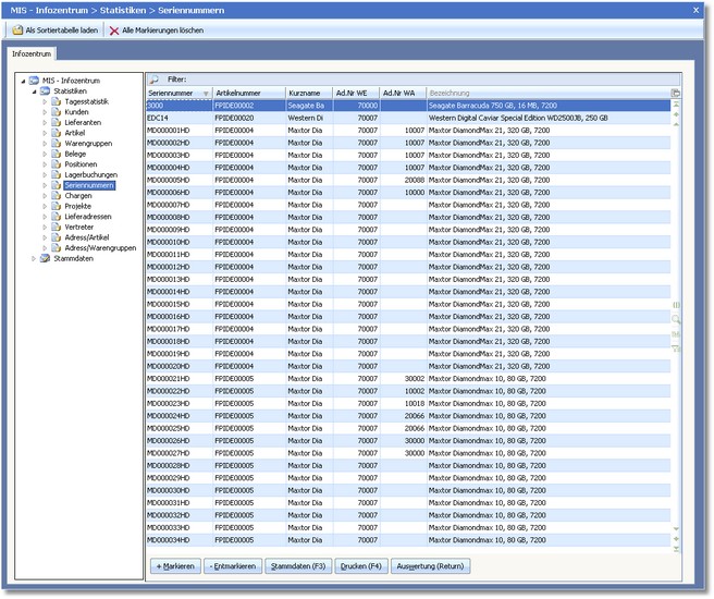 << Hier KLicken um eine Inhaltsübersicht anzuzeigen >> Navigation: Warenwirtschaft > Auswertungen > Informationszentrum > MIS-Infozentrum > Seriennummern |