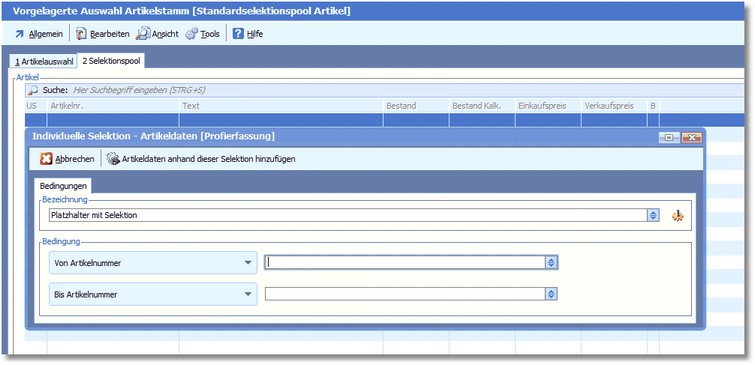 Es soll über einem Platzhalter eine Selektion aufgebaut werden, in der Von/Bis Artikelnummer selektiert werden soll.