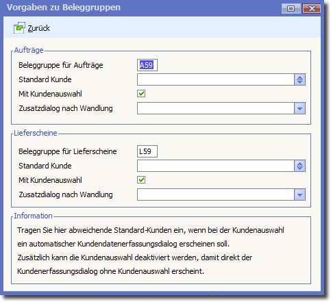 Hinterlegen Sie hier eine Kundennummer die automatisch vorgeschlagen werden soll, wenn die Belegart auf "Lieferscheine" geändert wird.