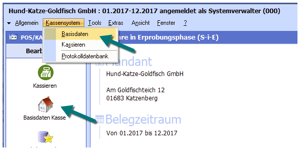 In den Basisdaten des Kassensystems können Sie grundlegende Einstellungen hinterlegen, die für das gesamte Kassensystem (also alle angelegten Kassen) wirken.