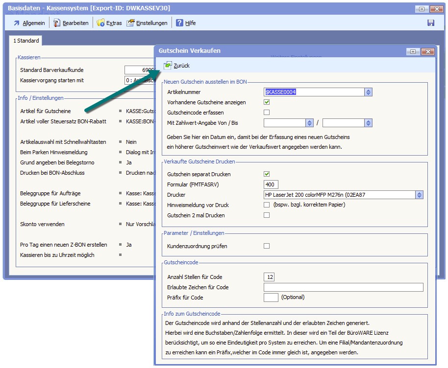 Die Optionsmaske "Gutschein verkaufen wird angezeigt, wenn Sie im Bereich "Info / Einstellungen" auf "Artikel für Gutschein" klicken und ebenso, wenn Sie im Menü "Bearbeiten" den Eintrag "Gutscheine" wählen.
