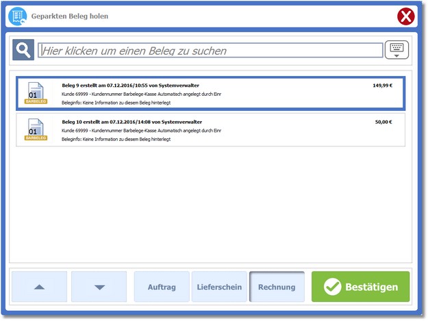 Der geparkte Beleg kann im Kassendialog über die Schaltfläche <Holen> ausgewählt und zur weiteren Bearbeitung wieder aufgerufen werden.