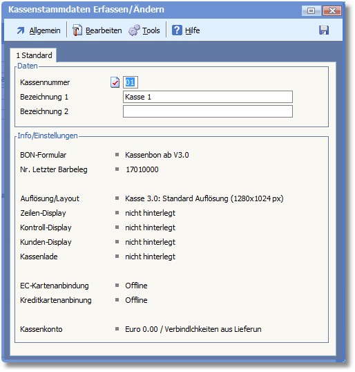 Navigation:  Kassensystem > Technische Informationen (Systeminformation) > Vorbereitende Arbeiten > Grundeinrichtung der Kasse > Detaileinrichtung der Kasse (Basisdaten) > Kassenstammdaten > Kassenstammdaten erfassen/ändern >