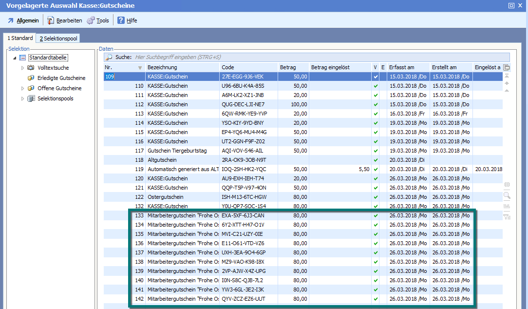 Mit dem Button "OK" werden die Gutscheine angelegt und in den BON übernommen.