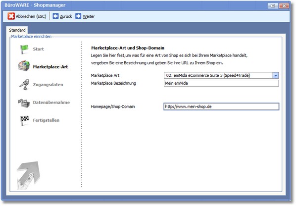 4. Hier tragen Sie zunächst die MARKETPLACE ART, MARKETPLACE BEZEICHNUNG und HOMEPAGE/SHOP-DOMAIN ein.