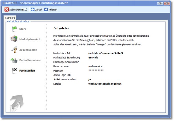 9. Überprüfen Sie die Einstellungen. Bei Bedarf können Sie die <Zurück>-Funktion der Menüleiste nutzen, um die eingegebenen Daten nochmals zu bearbeiten. Klicken Sie anschließend auf <Anlegen>.