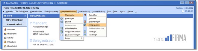 1. Klicken Sie mit der Maus im Hauptmenü auf "Anlagenbuchhaltung > Stammdaten > Anlagegruppen".