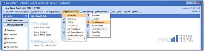1. Klicken Sie mit der Maus im Hauptmenü auf "Anlagenbuchhaltung > Stammdaten > Versicherungen".