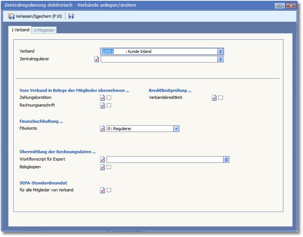 Das Programm öffnet den Dialog "Zentralregulierung debitorisch - Verbände anlegen/ändern".