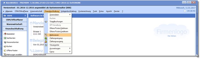 | 1. | Klicken Sie mit der Maus im Hauptmenü auf "Finanzbuchhaltung > Mahnwesen". |