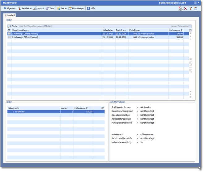 Der Mahnvorschlag ist stapelorientiert. Es wird pro Mahnlauf ein Stapel für alle Mahnungen angelegt und jeweils ein Stapel pro Mahngruppe. Sie können sowohl den Stapel aller Mahnungen bearbeiten als auch die einzelnen Mahngruppenstapel.