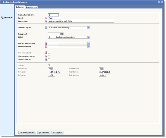 Um die Karteikarte "Aufteilungen" frei zu schalten, speichern Sie zunächst Ihre Kostenstellenschablone ohne Bezugswert!