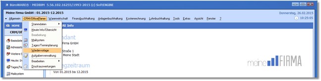 1. Klicken Sie mit der Maus im Hauptmenü auf "CRM/OfficePlaner > Wiedervorlage".