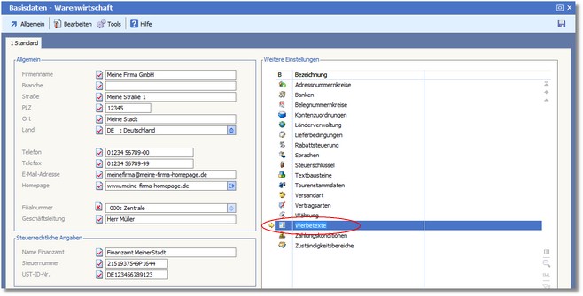 << Hier KLicken um eine Inhaltsübersicht anzuzeigen >> Navigation: Warenwirtschaft > Stammdaten > Basisdaten > Werbetexte |