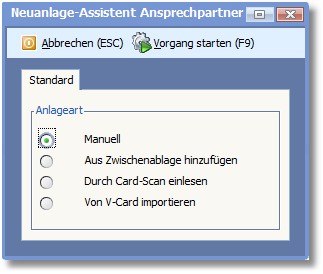 3. Legen Sie durch Aktivierung des entsprechenden Radiobuttons fest, auf welche Art und Weise der neue Ansprechpartner erfasst werden soll und drücken Sie [F9].