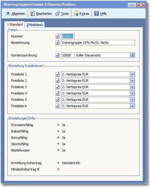 Geben Sie hier die Warengruppennummer an. Dieser 5-stellige Schlüssel bildet das Such- und Ordnungskriterium der Warengruppen.