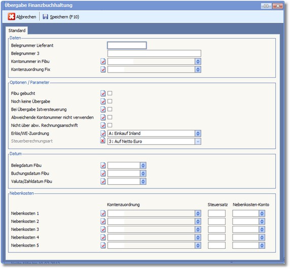 können Sie bis zu 5 Nebenkosten in der Belegwährung erfassen. Zu jedem dieser Kosten kann die Kontenzuordnung, ein Steuersatz und ein Nebenkosten-Konto eingetragen werden.