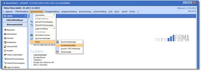 1. Klicken Sie mit der Maus im Hauptmenü auf  "Warenwirtschaft > Extras > Intrahandelsstatistik".