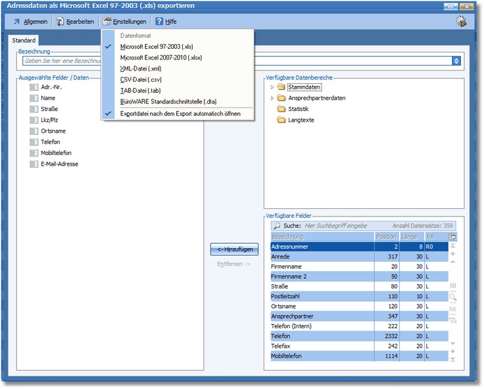 Die Datenfelder, welche exportiert werden sollen, werden im gleichen Verfahren hinzugefügt oder entfernt wie z.B. beim Konfigurieren der darstellbaren Tabellenfelder des Selektionspools.