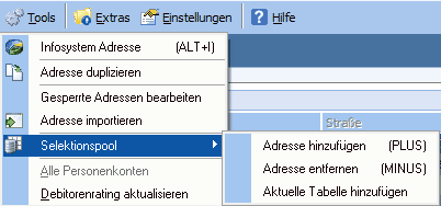 Beim Hinzufügen von Adressen kann bedienerbezogen automatisch der oder die Ansprechpartner der gewählten Adresse übernommen werden. Ob dies passieren soll, entscheidet die Einstellung im Funktionsmenü "Einstellungen > Zum Selektionspool immer Ansprechpartner hinzufügen".