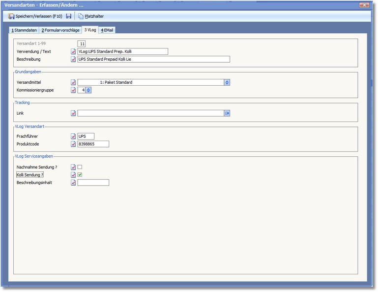 So sollten die Einstellungen einer Versandart für VLog aussehen: