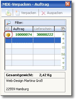 Dieser Symbolbutton startet den Verpackungsdialog für den in der Auswahltabelle markierten Auftrag.