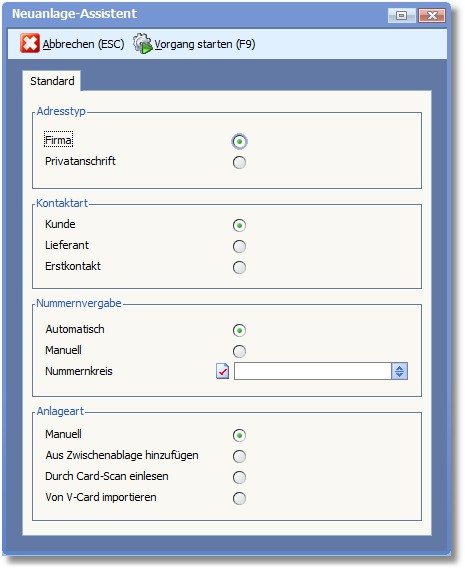 Im Neuanlageassistenten werden zunächst allgemeine Parameter für die Adresse festgelegt: