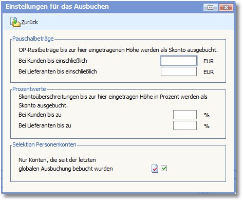 Legen Sie in diesen Feldern jeweils den Betrag in Euro fest, bis zu welchem Rest-Ops als Skonto ausgebucht werden sollen.