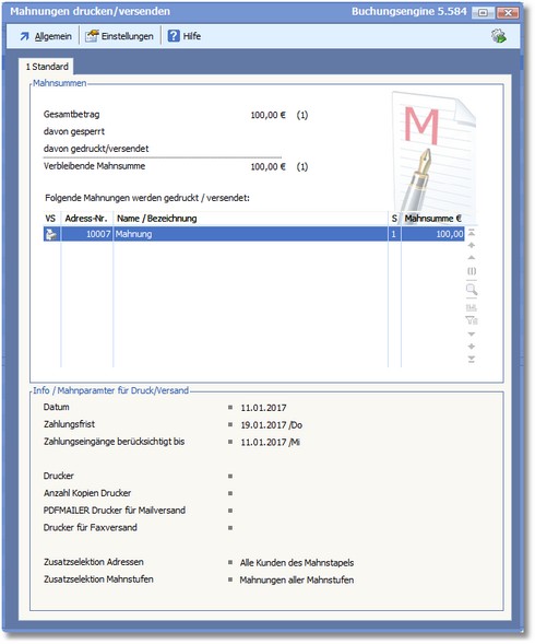 Der Druck gilt immer für alle Mahnungen des gewählten Stapels. Das kann sowohl der komplette Stapel des Mahnlaufes sein oder der Stapel der Mahngruppe.