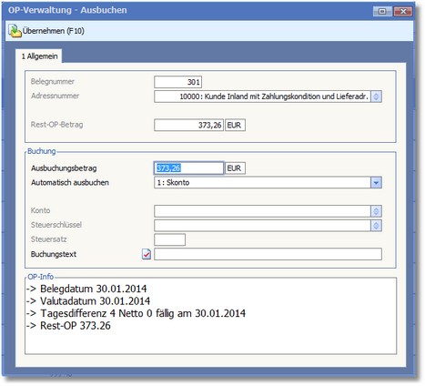 Wenn Sie nach Eingabe Ihrer Daten auf den Button <Übernehmen> klicken, wird der Ausbuchungsdialog geschlossen und der Ausbuchungsbetrag in die Tabelle der OPs zum Ausziffern/Ausbuchen eingetragen.