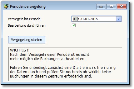 Versiegelt werden alle Perioden bis zu der in diesem Feld angegebenen Periode. Geben Sie also die Periode 3 an, so werden die Perioden 1,2 und 3 versiegelt bzw. abgeschlossen.