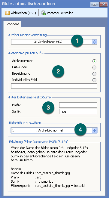 Tragen Sie Präfix und Suffix des Dateinamen ein, so dass nur der teil des Dateinamens verglichen wird, der dem Inhalt im zugeordneten Feld (Artikelnummer, EAN usw. – siehe Pkt. 2) entspricht.