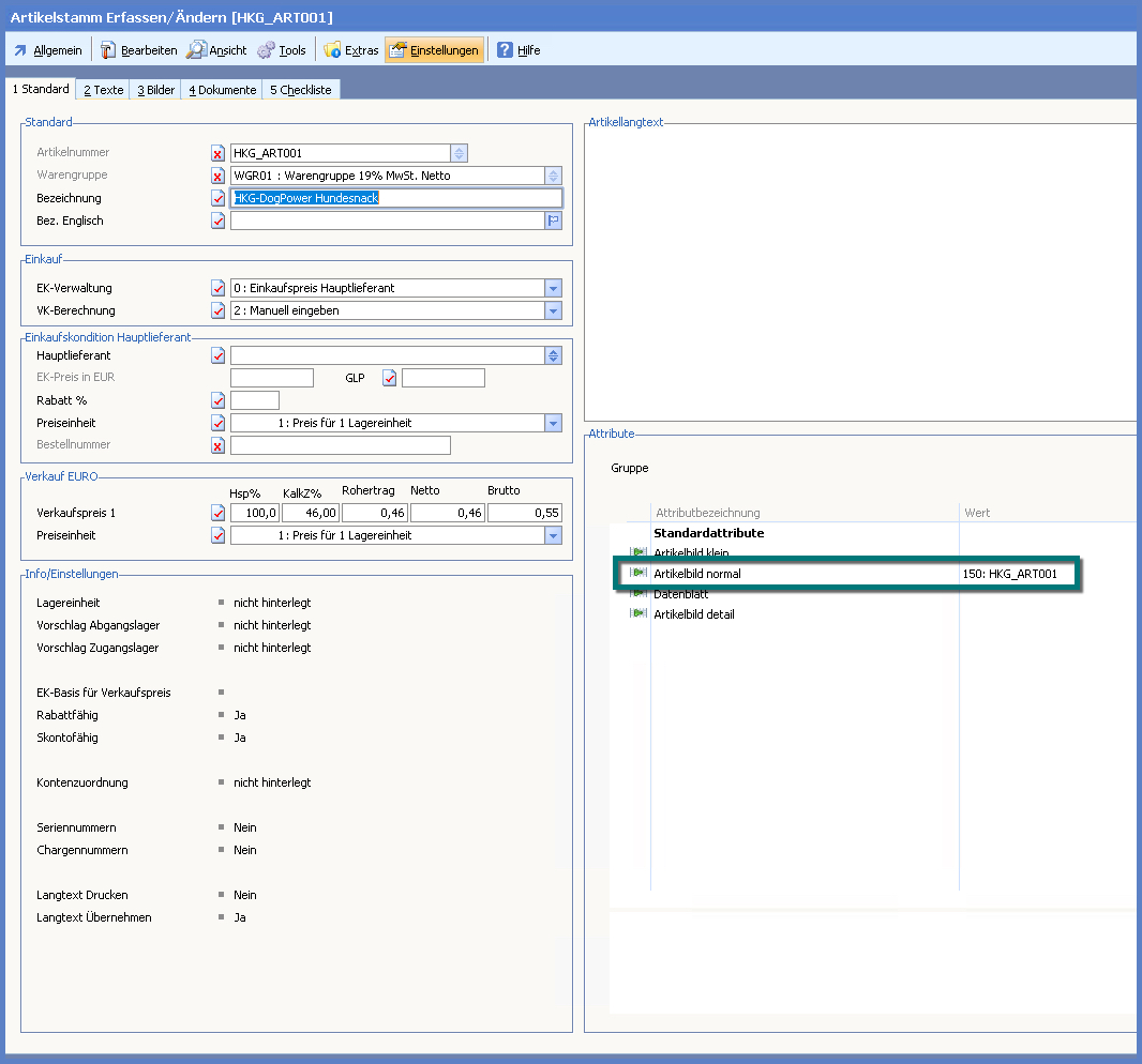 Im Artikelstamm finden Sie jetzt das zugeordnete Bild im vorher ausgewählten Attribut.