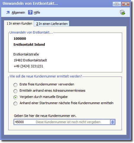 Erstkontakte können über eine Menüfunktion in einen Kunden oder Lieferanten gewandelt werden.