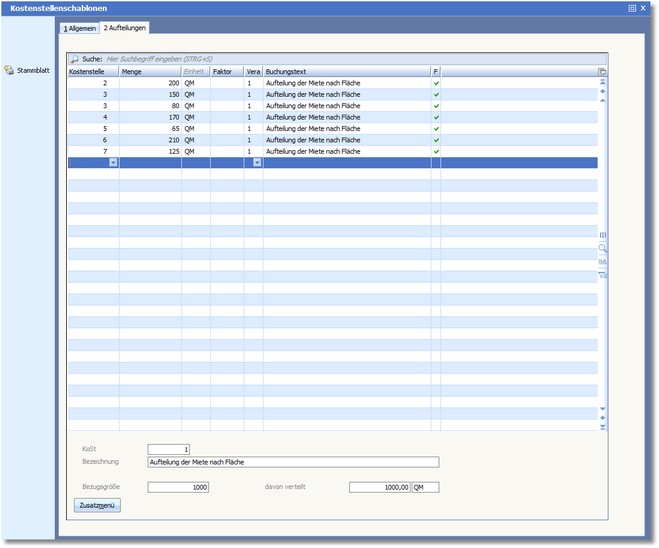 Bei einer Verteilung des Gesamtbetrags auf mehrere Kostenstellen, müssen Sie als Menge den Anteil an der gesamten zu verteilenden Größe eingeben. Die Mengen aller Aufteilungen müssen zusammen den in der Karteikarte "Allgemein" angegebenen Bezugswert ergeben.