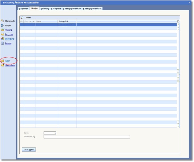 1. Um die Budget-,Planungs- oder Prognosetabelle zu füllen, klicken Sie mit der Maus auf das Icon <Füllen> in der Symbolleiste im Erfassen-/Ändern Dialog des jeweiligen Stammsatzes.