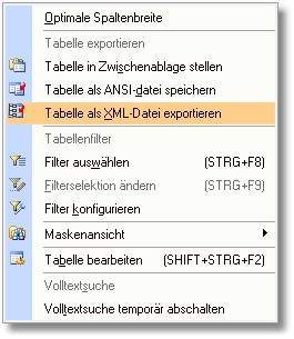 2. Im Auswahlmenü klicken Sie mit der Maus auf den Eintrag "Tabelle als XML-Datei exportieren".