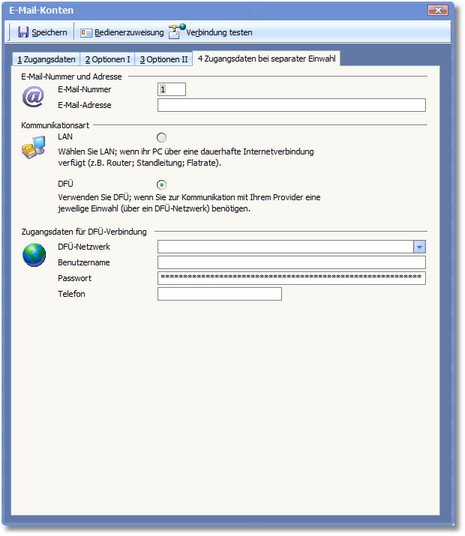 Die Karteikarte "Zugangsdaten bei separater Einwahl"