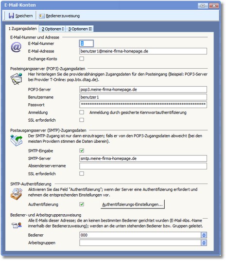 Damit die Benutzer E-Mails versenden und empfangen können, müssen die E-Mail-Stammdaten angelegt werden. In den E-Mail-Konten geben Sie die in Ihrem Unternehmen verwendeten E-Mail-Adressen, die dazu gehörigen SMPT- und Pop3-Server mit den entsprechenden Passwörtern und Parametern ein.